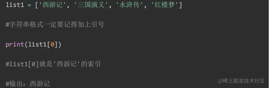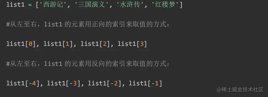 上面我们讲到了列表的索引,我们可以通过列表的索引来获取它的元素,示例如下: