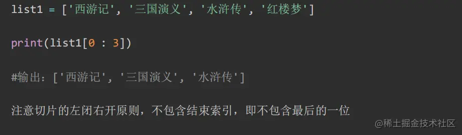 注意切片的结果不包含结束索引,即不包含最后的一位,通常我们称为 左闭右开 , -1 代表列表的最后 一个位置索引