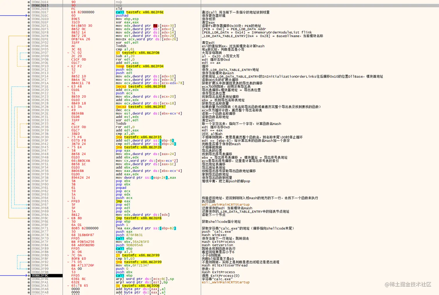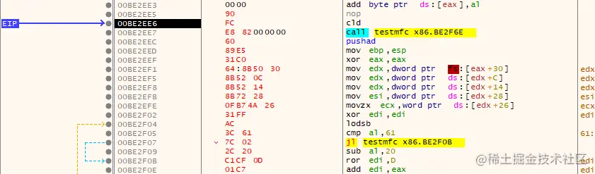 00BE2F2B | E3 3A | jecxz testmfc x86.BE2F67 | 如果数量为0则跳转(无名称导出函数或者遍历完整个导出表没找到要找的函数)