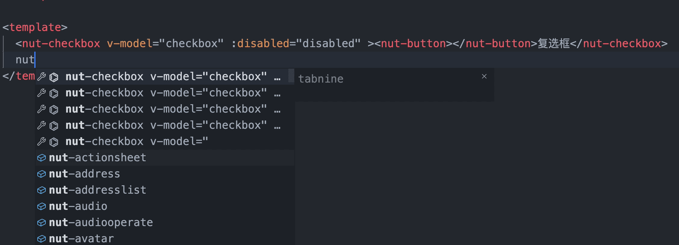 我们使用 NutUI 组件库进行项目开发,当我们输入 nut- 时,编辑器会给出我们目前组件库中包含的所有组件,当我们使用上下键快速选中其中一个组件进行回车,这时编辑器会自动帮我们补全选中的组件,并且能够带出当前所选组件的其中一个 props,方便我们快速定义。