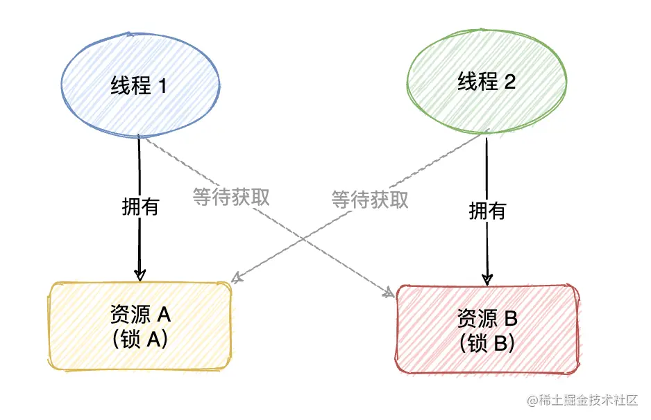比如线程 1 拥有了锁 A 的情况下试图获取锁 B,而线程 2 又在拥有了锁 B 的情况下试图获取锁 A,这样双方就进入相互阻塞等待的情况,如下图所示:
