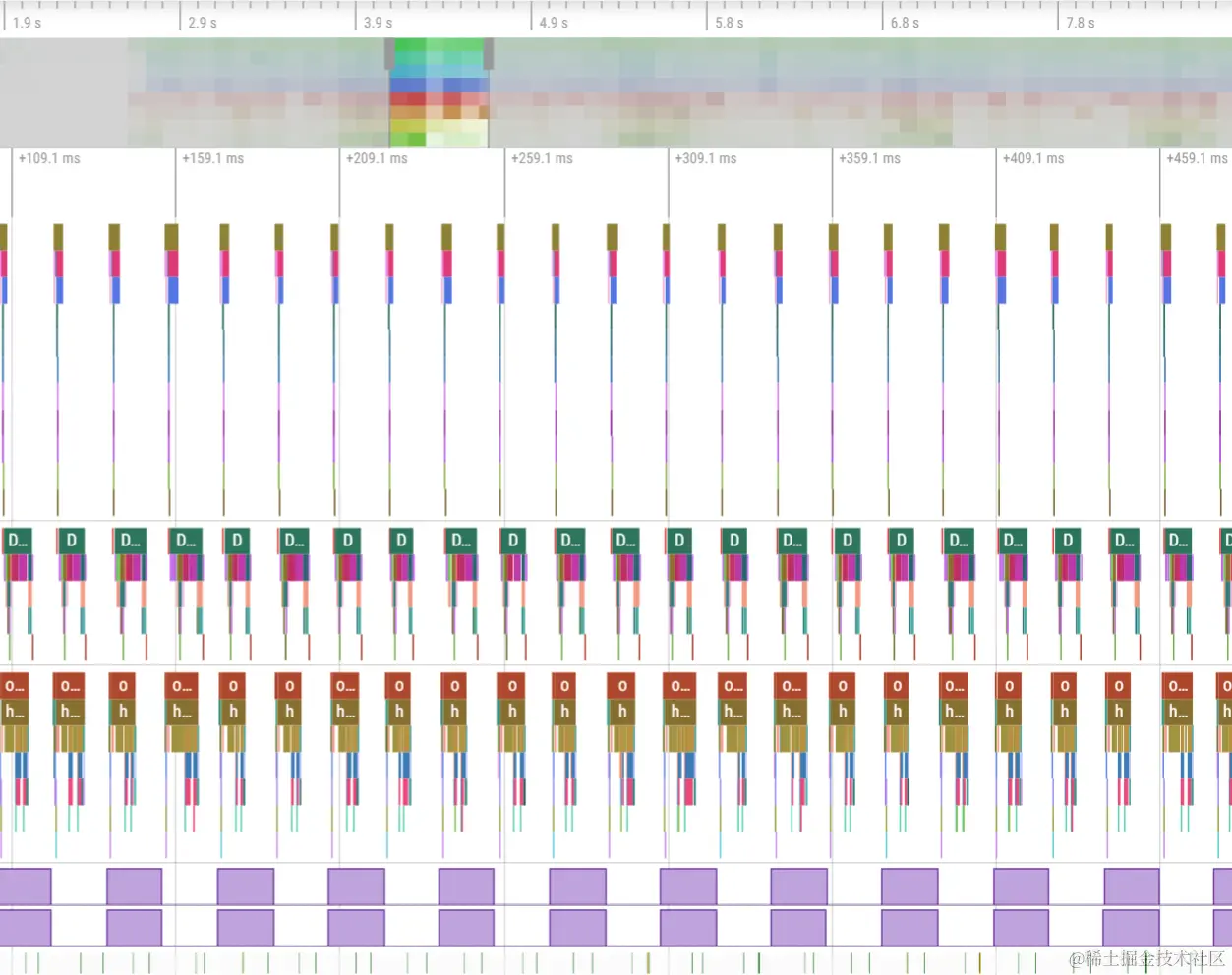 其中,绿柱异常放大表明两个Vsync之间耗时显著增长,红柱异常放大表明应用层应用加速使用的DisplayLists大量增长、或图形层使用GLES调用GPU耗时显著增多导致的GPU执行绘制指令耗时变长。