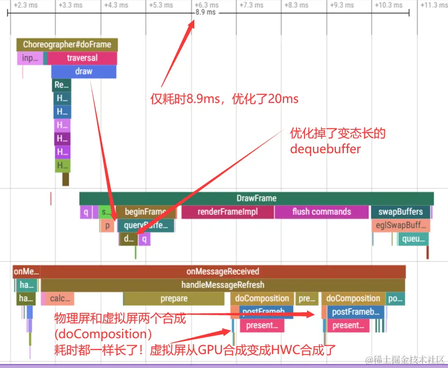 结合图中提示的trace tag、耗时,可以得出结论,使用GPU合成的虚拟屏中因GPU合成耗时很长,导致它显著高于物理屏HWC合成耗时。如果GPU合成能够和HWC合成一样快,或者干脆让虚拟屏也使用HWC合成,那么可以预期SurfaceFlinger的合成工作的消耗将显著降低。
