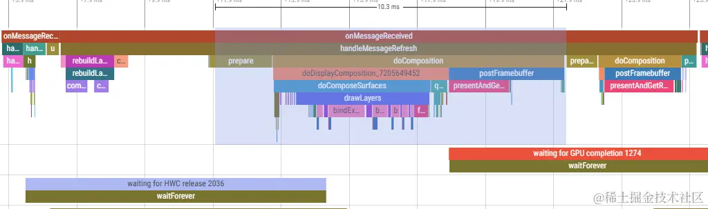 GPU Completion来看,此时GPU正在为SF工作,因为在图中看到(不好意思没有截全,下图你是看不出来的),dequeueBuffer总是在SF的GPU Completion结束之后结束的,这就表明SF正在通过GPU消费buffer(调用GPU进行合成后提交,然后标记buffer允许被渲染线程dequeue)。dequeueBuffer获取到就绪的buffer此时此刻取决于SF的消费能力——因为case中它是短板。(当然图形层的buffer可用不止SurfaceFlinger需要释放,因为SF释放后buffer实质上流转到更底层的HWC,等它将Buffer提交到屏幕后才会释放,这里释放后才能给App再次使用(上面哪个模型图把SF和HWC合并为流水线的图形层buffer消费者)。从perfetto报告看HWC release非常及时、余量充足,SF的GPU Completion则较紧密地接着dequeueBuffer返回,基本断言是SF太慢了——排除HWC的责任。(下图看不出来,当时没有截图到HWC的release情况。)