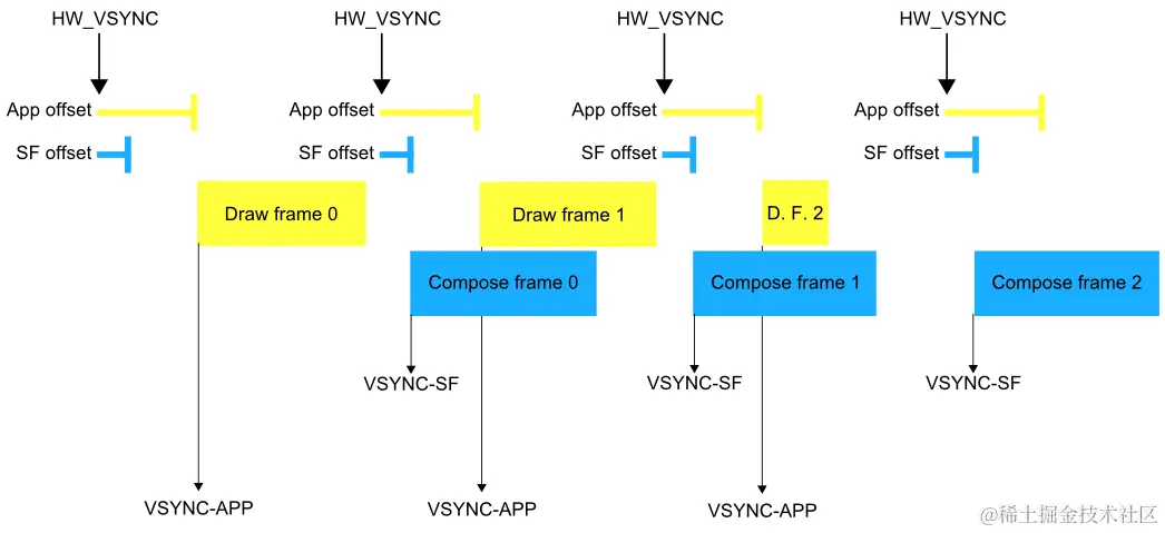 EventThread会在requestNextVsync调用后才会将下一个VSYNC-sf或VSYNC-app发出。因此,当(各自EventThread的)requestNextVsync没有调用时,VSYNC-app和VSYNC-sf也就出现漂移。BufferQueueLayer::onFrameAvailable会在应用提交后调用,该方法通过调用SF的signalLayerUpdate触发产生下一个VSYNC-sf。