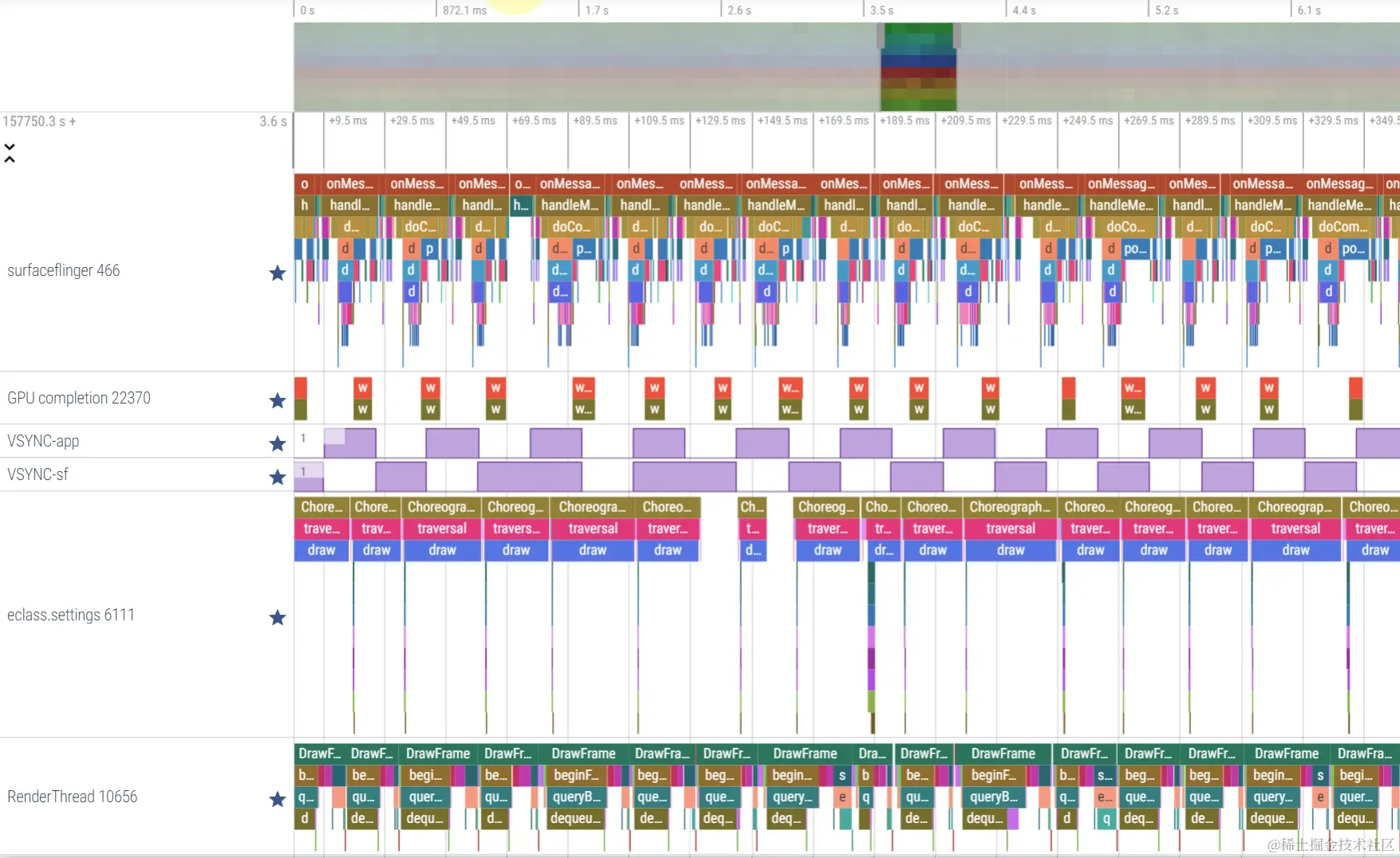 本小节介绍问题追踪过程,通过一些方法定位到各阶段的耗时原因,并定性地得出case性能问题的性质。从本小节开始,围绕Perfetto进行分析。这里贴出perfetto的总览,我将关键的信息排序到顶部。前四行分别为SF负责图形的线程、提交到GPU等待完成的工作、Vsync-App、Vsync-sf,最后两行为case中出现卡顿掉帧的App的主线程(UI)和渲染线程(RenderThread)。