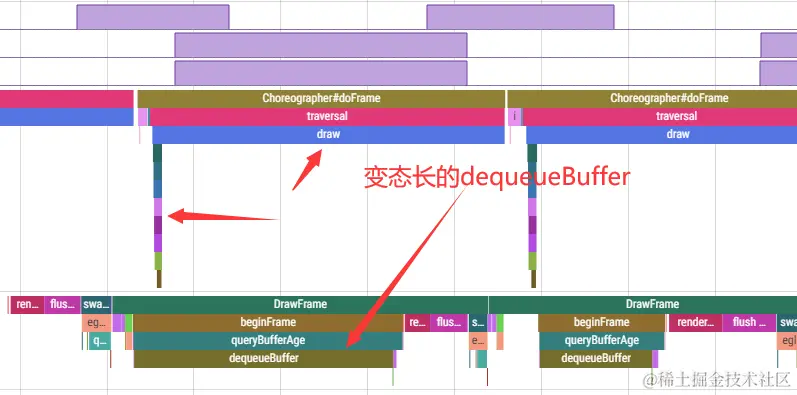 dequeueBuffer的严重异常耗时,执行渲染的部分耗时相对于正常的case几乎没有差异,这可以断言渲染线程的惨烈耗时主要就是被dequeueBuffer浪费了。从