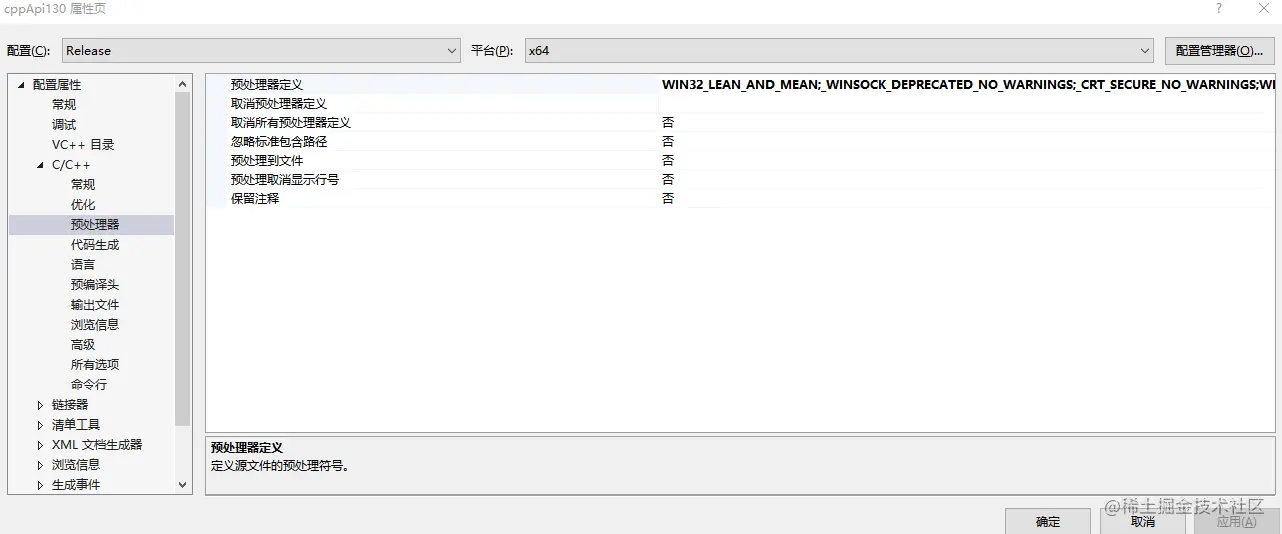 C/C++ ->预处理器:添加选项WIN32_LEAN_AND_MEAN;_WINSOCK_DEPRECATED_NO_WARNINGS;_CRT_SECURE_NO_WARNINGS;WINDOWS;NOMINMAX;