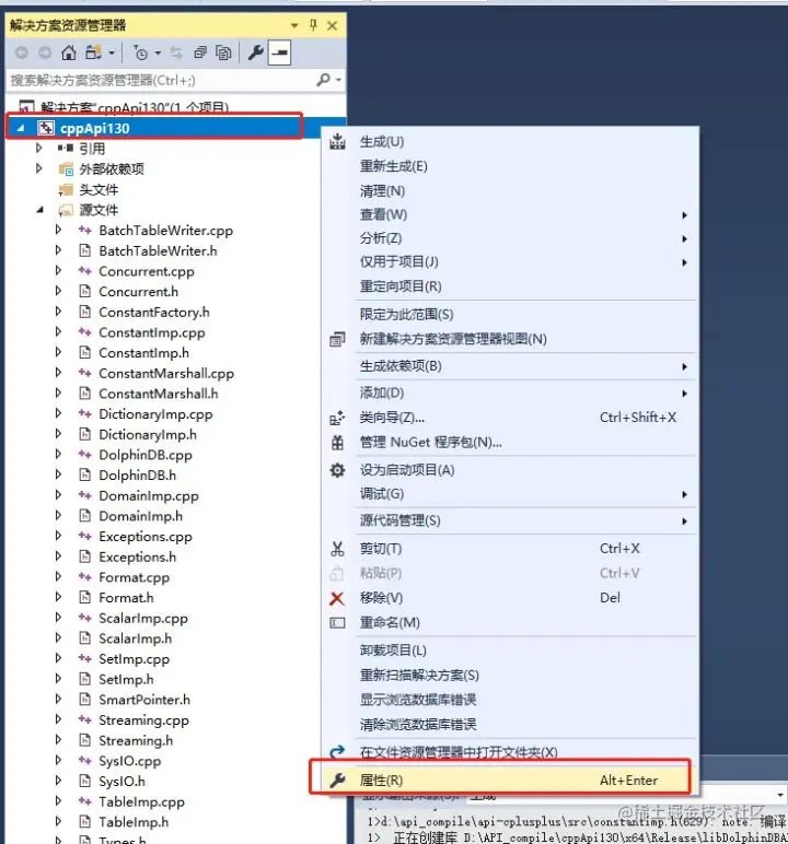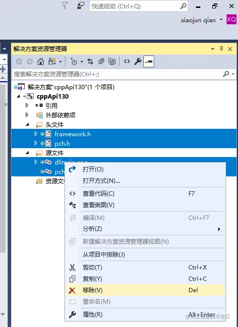 选中解决方案资源管理器中的项目 cppApi130,然后再选择主菜单项目->属性,弹出“属性页”对话框。或者右键该项目弹出菜单后选中属性。