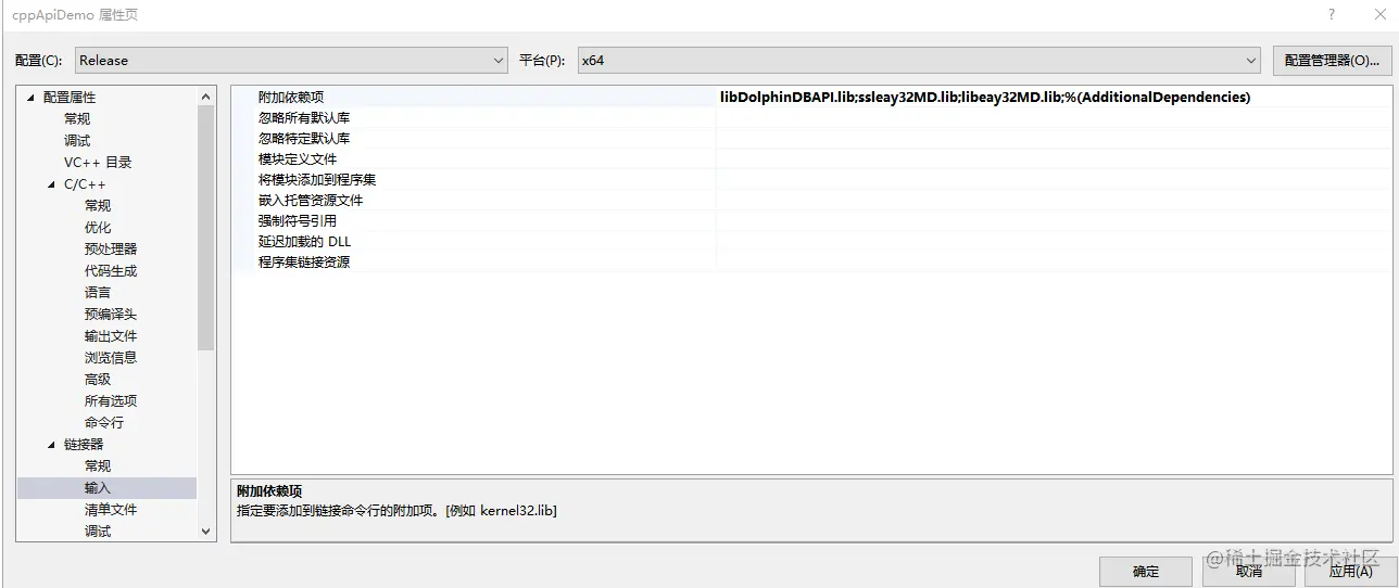 链接器 -> 输入 -> 附加依赖项:添加依赖项libDolphinDBAPI.lib;ssleay32MD.lib;libeay32MD.lib;