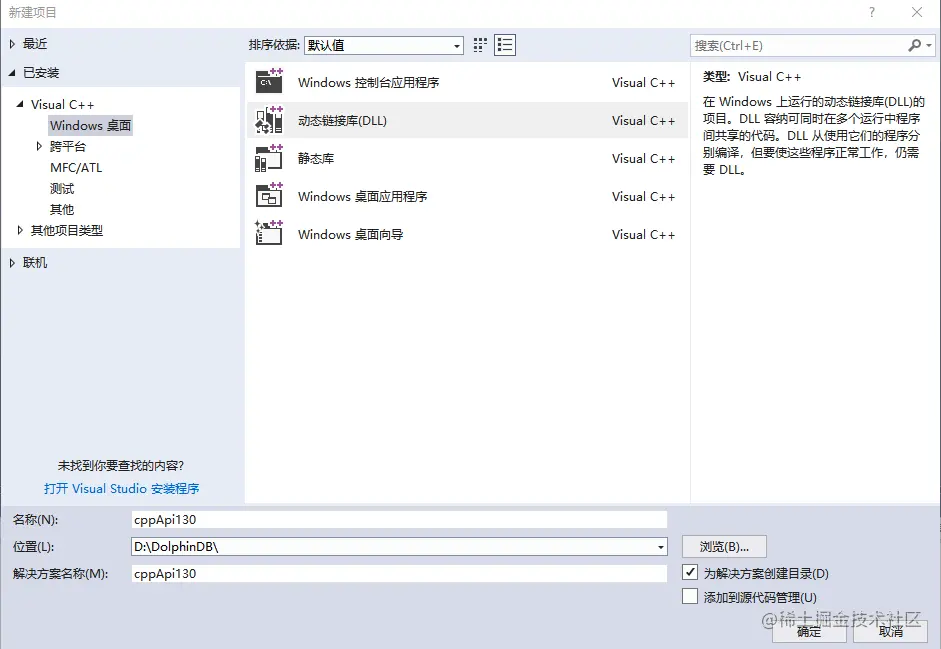 打开 Visual Studio 后,点击主菜单文件 -> 新建 -> 项目,弹出 新建项目对话框。在对话框左侧面板中的 Visual C++ 下选择windows 桌面,中间面板中选择动态链接库(DLL),然后在下面编辑框中输入工程名称和保存路径,如下图所示: