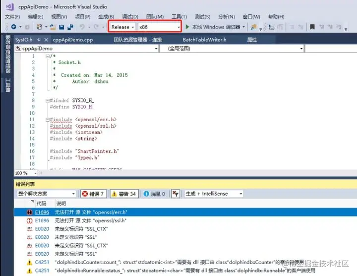 解决方案:可能由于库文件目录书写错误,请检查4.3节步骤(1)中包含的头文件和目录是否正确。 - 运行时报 libDolphinDBAPI.dll 或 ssleay32MD.dll、libeay32MD.dll 库找不到的错误