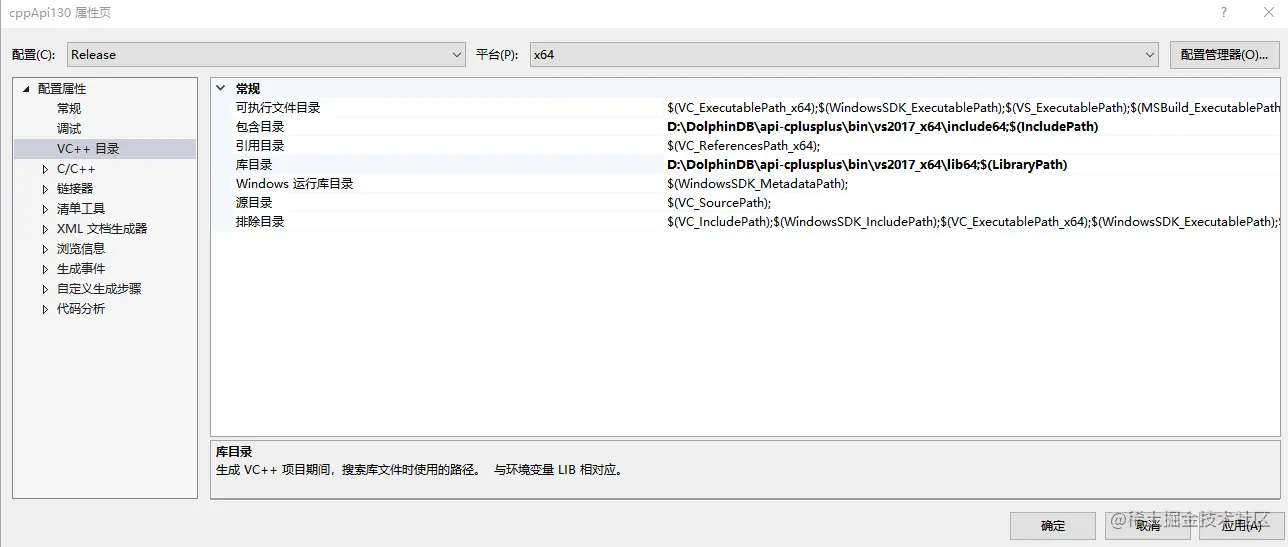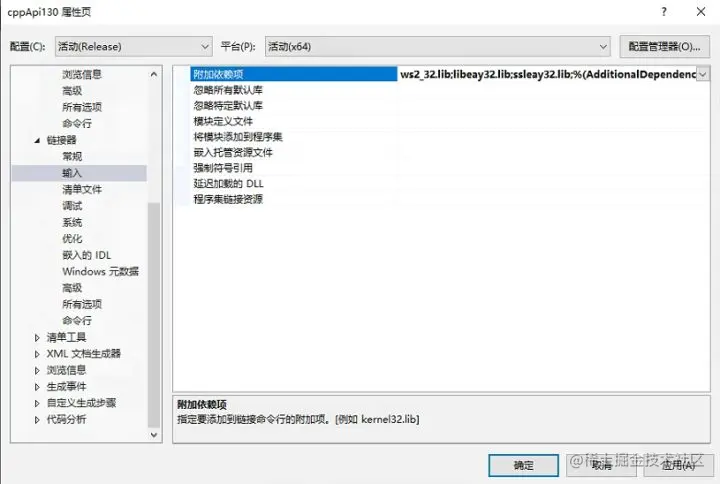 包含目录:添加 OpenSSL 和 API 的头文件目录库目录:添加 OpenSSL 和 API 的库目录。