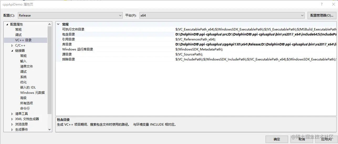 先选中解决方案资源管理器中的项目cppApiDemo,然后再选择主菜单 项目 -> 属性,或者右键解决方案资源管理器中的项目cppApiDemo,然后选择属性,弹出“属性页”对话框。