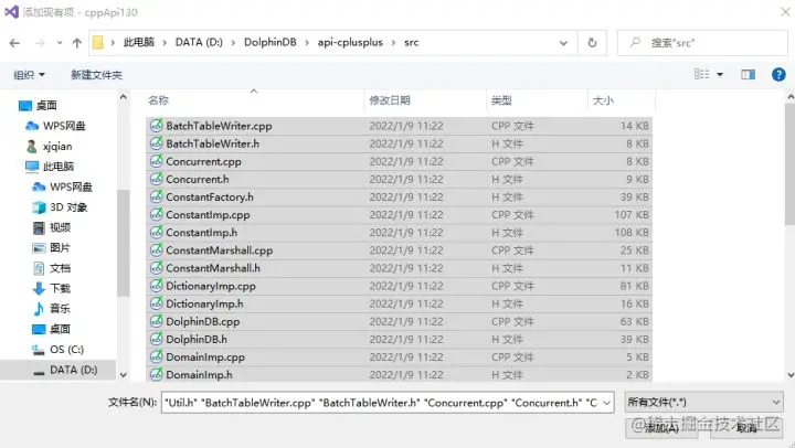 然后选择主菜单源文件 -> 添加 -> 现有项,弹出添加现有项对话框,如下图所示,选中下载的 API 代码(src 子目录下所有 .cpp 文件和 .h 头文件),再点击添加按钮: