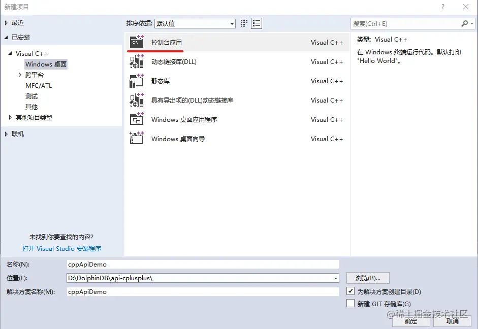 打开 Visual Studio 后,点击主菜单文件 -> 新建 -> 项目,弹出“新建项目”对话框。在对话框左侧面板中的 Visual C++ 下选择 windows桌面, 中间面板中选择控制台应用,然后在下面编辑框中输入工程名称 appApiDemo 和保存路径,如下图所示: