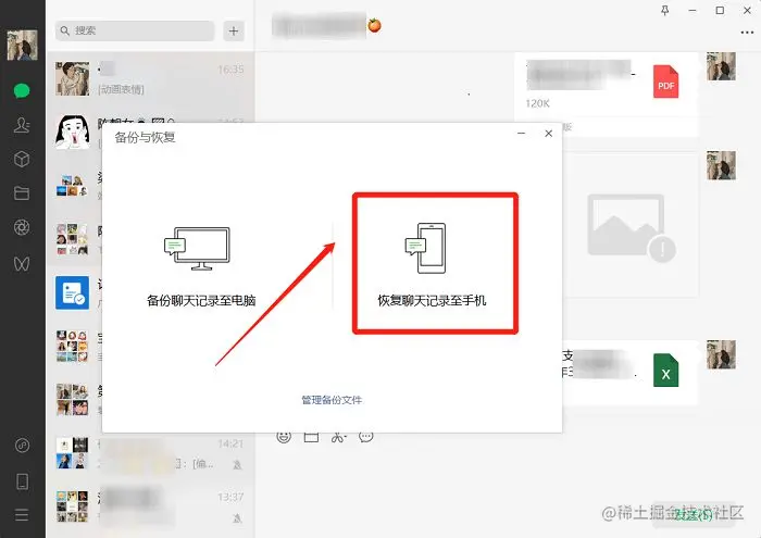 步骤二: 在弹出的新页面【备份与恢复】后,选择【恢复聊天记录至手机】,随后在手机上收到微信上的操作提示,只需要根据提示操作即可。