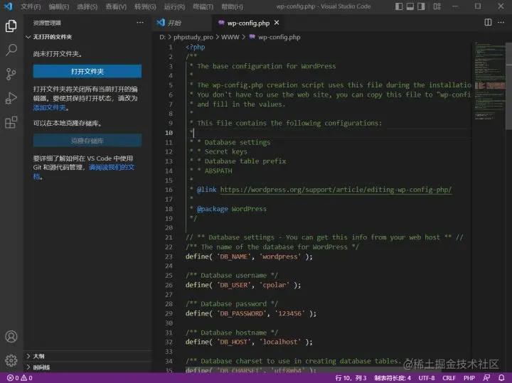 打开后的wp-config.php文件,看起来是这个样子的