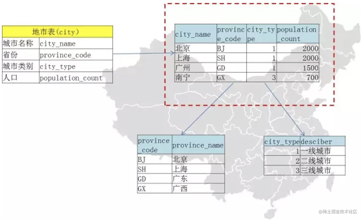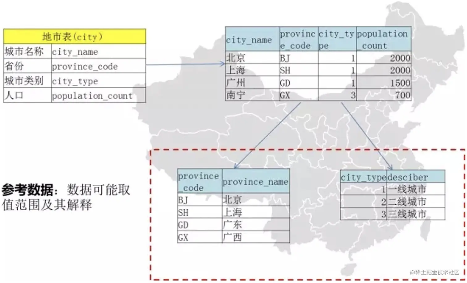 在本文引用的假设案例中,我们将会注意到刚才填写的地市这类数据有些列,如省份、城市类型等。如果没有缺少上下文的环境,我们是无法理解其具体含义,这时候我们往往引入参考数据(reference data)加以解释和理解,如下图红色标注所示。