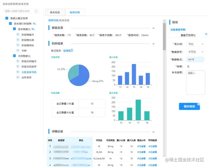 根据标准制定流程,平台提供数据库拾取能力,对标准进行识别,根据识别结果来得出结论 ,即完整的数据元定义。下面是根据数据元概念进行识别的页面参考。