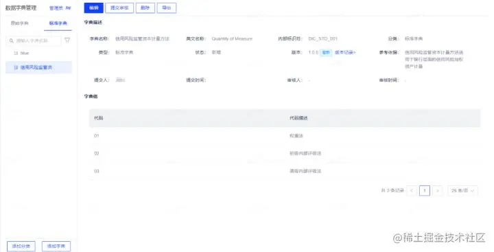 数据字典管理内容包含原始字典及标准字典,可以认为原始字典是原始数据项的值域分布, 标准字典是标准数据项的值域分布。原始字典可主动录入,也可通过数据探查的值域分布进行生成;标准字典满足与数据元同样的生命周期管理,也支持批量导入导出操作。