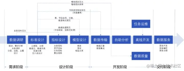 在具体实施过程中,我们期望按照“需求-设计-开发-交付”流程进行建设。在需求设计阶段,应对数据现状进行摸排,确定治理范围以及标准的制定范围。从而在后续的设计中能够规范指标及模型设计,从源头上开始控制元数据及数据的质量,指导开发过程的具体实施。