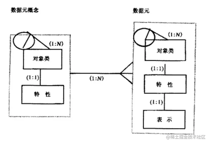完整的数据元应当由三部分组成,对象类、特性及表示,如下图所示,只有当对象类及其特性绑定了表示时,才能由数据元概念转变为真正的数据元。