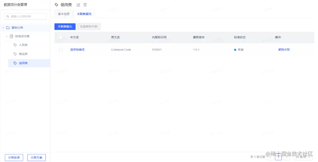 因此数据项分类支持分类的基本信息管理,也支持对数据元批量进行关联以及解除关联。