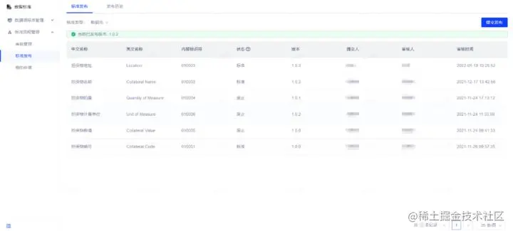标准发布采取整包发布的方式,若将同一批次的数据元列表发布一个大版本,保证平台的标准参考基线。需要支持查看当前更新的内容,提交发布申请,比对版本差异,支持查看发布历史等。