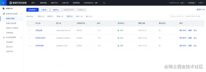 数据元管理是标准管理核心内容,支持表单及批量导入的方式录入数据元,按照标准生命周期草案、试用、标准、废止对数据元进行管理,支持数据元的批量导出,满足不同场景下查看数据元的需求。定义时也将数据元与稽核规则进行绑定,为质量检测提供依据。