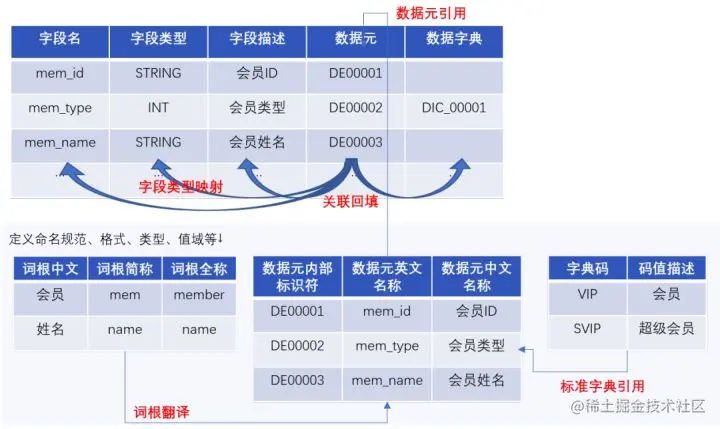 - 原始字典:数据库逆向采集、元数据注册时填写字段枚举值、数据探查时值域分布计算、手动录入;