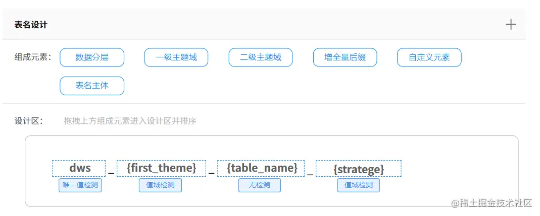 对于分层下的表,需要配置表名设计规范,将选取命名要素按照一定顺序排列,得到命名规则