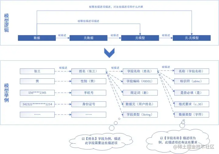 可以看出,元数据是个相对的概念,元模型即为元数据的元数据,为了更方便大家理解,这里提供一个实例解释: