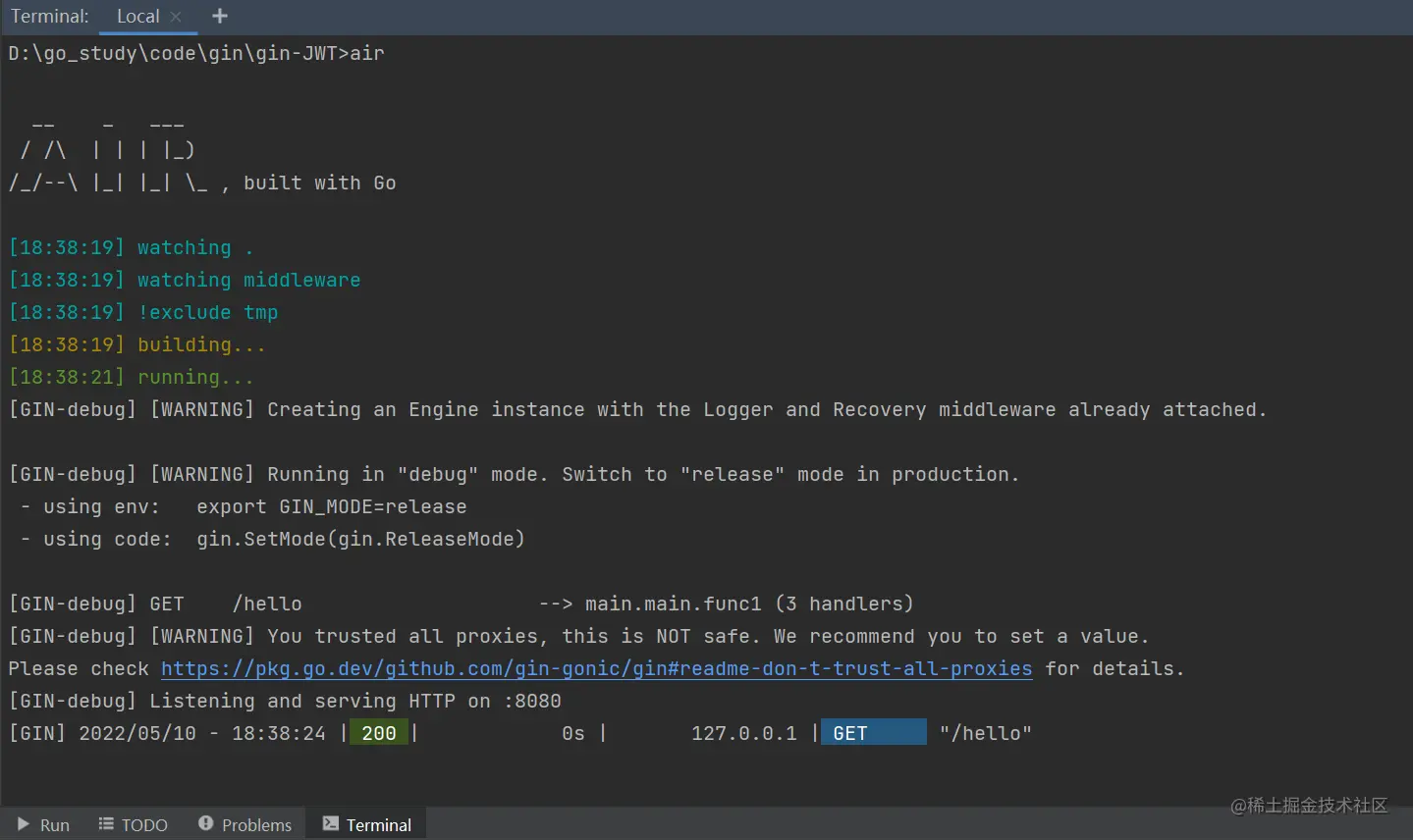 - 尝试使用Air实现热部署 最近在字节后端青训营的学习中,初步体验了Gin框架,并打算结合JWT和Air实践一下。