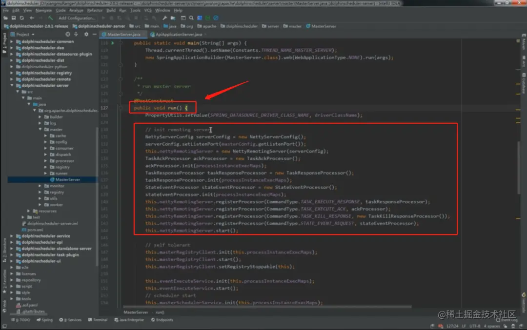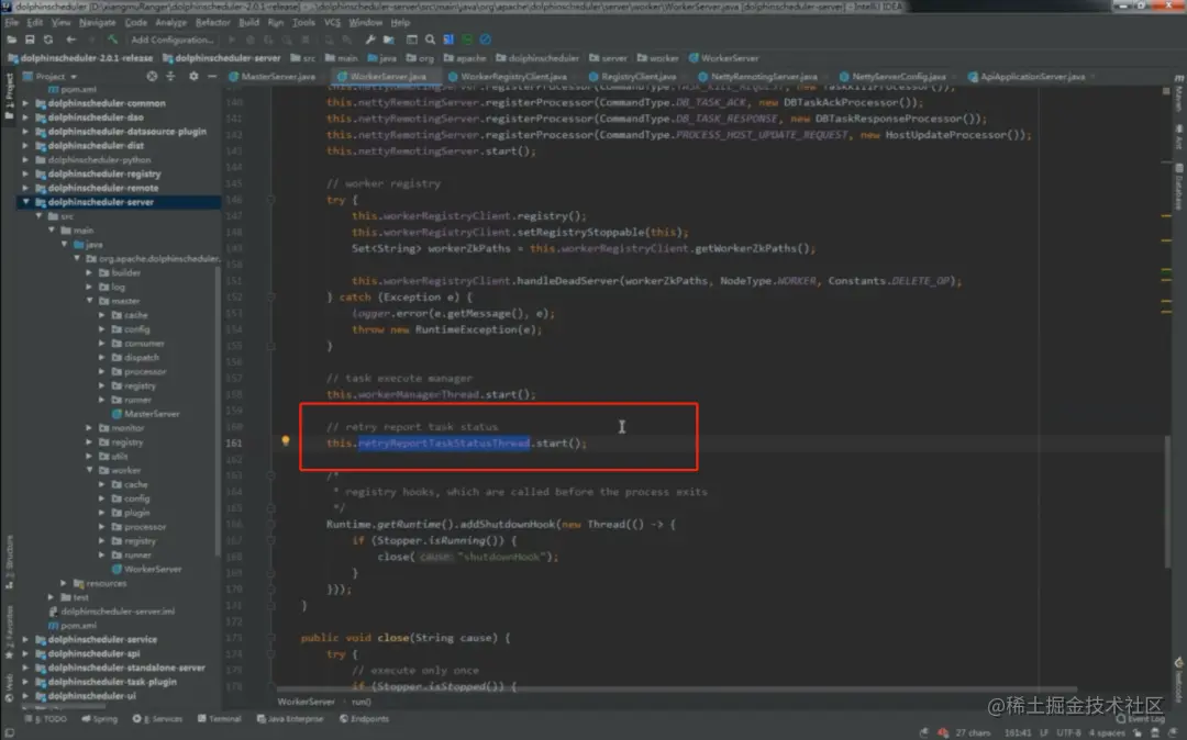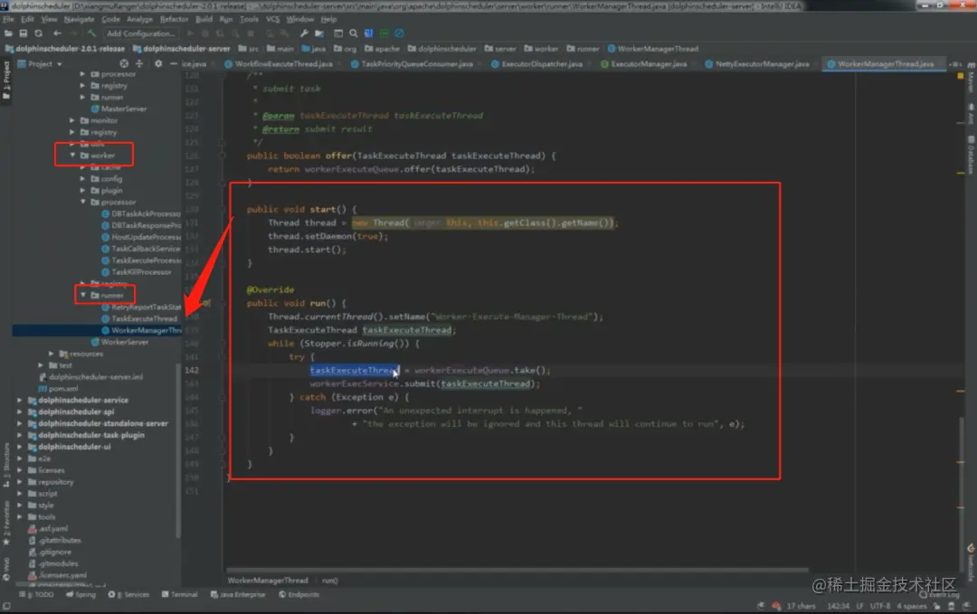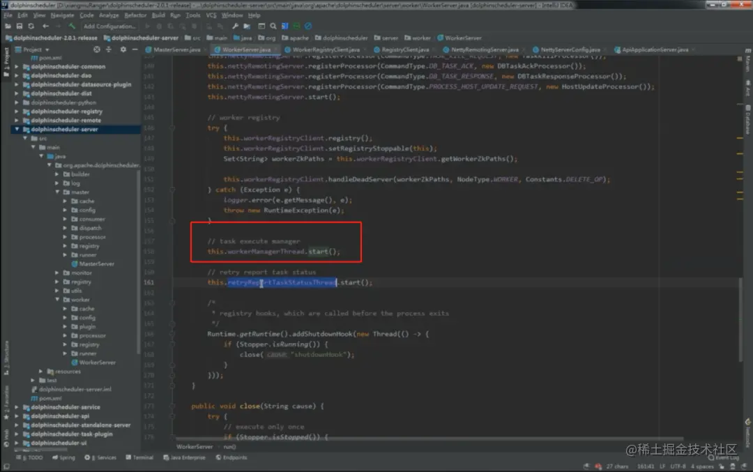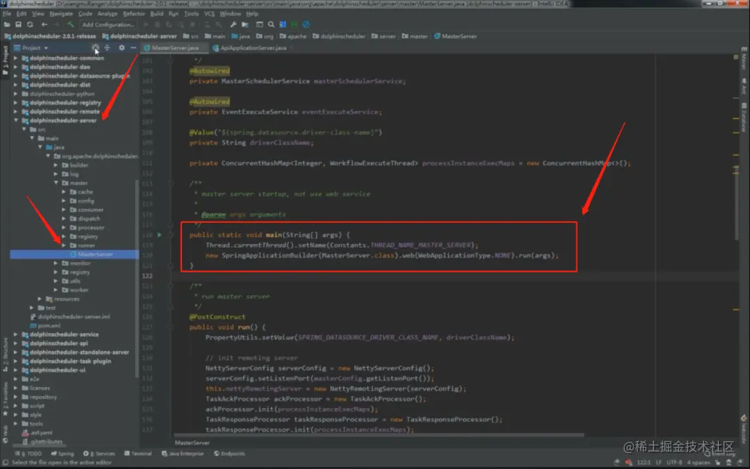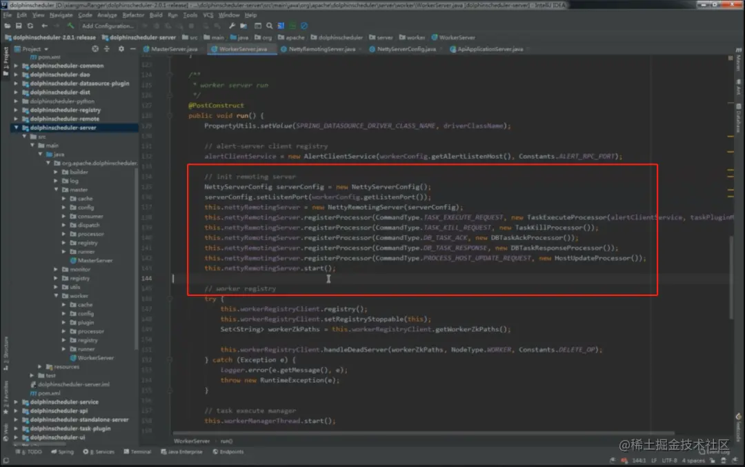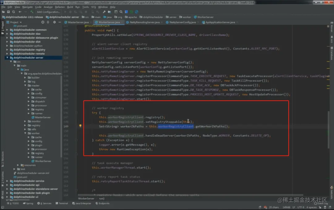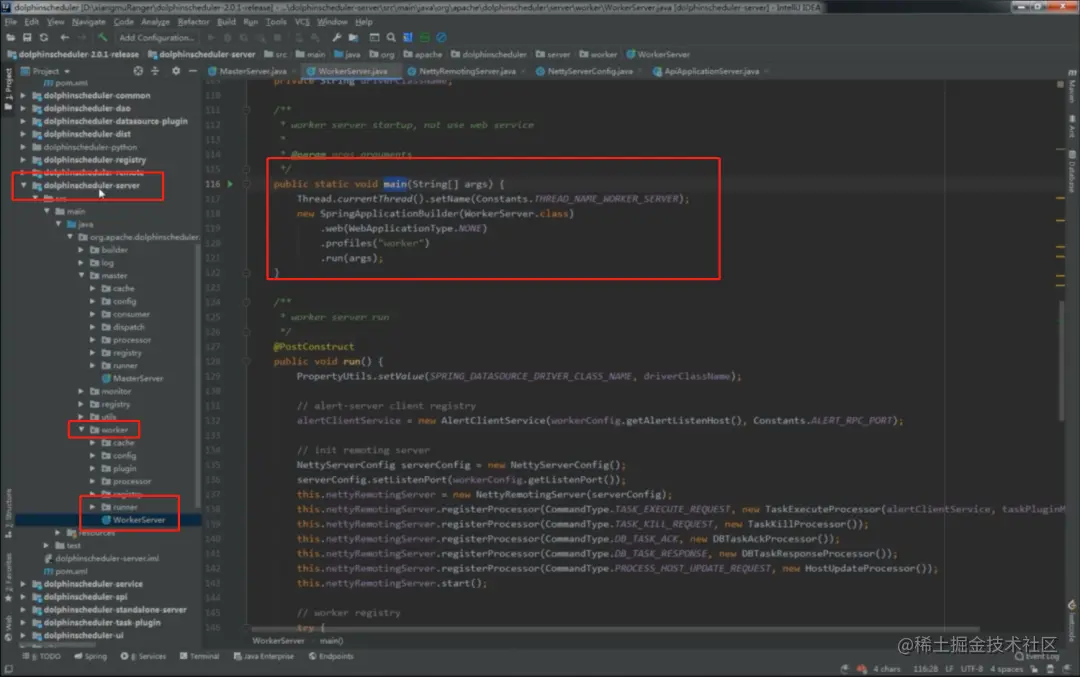 找到WorkServer.java中的main方法,进程代码也位于DolphinScheduler-Server模块下面