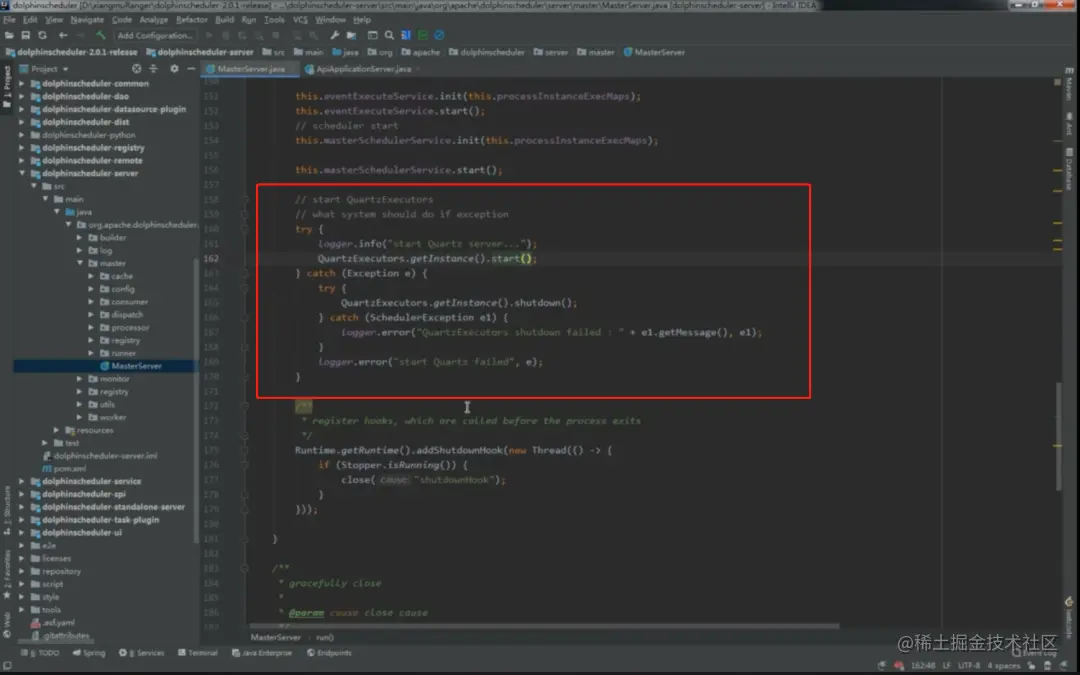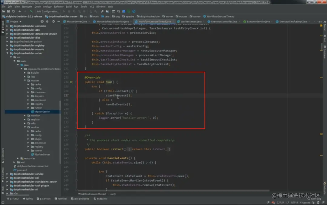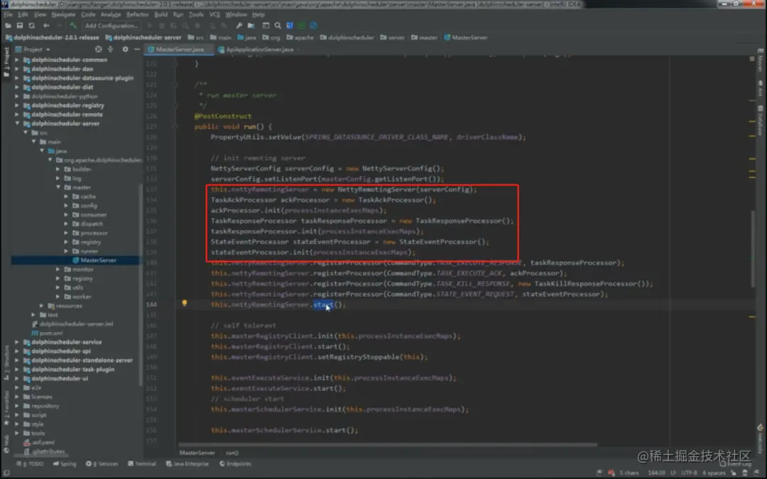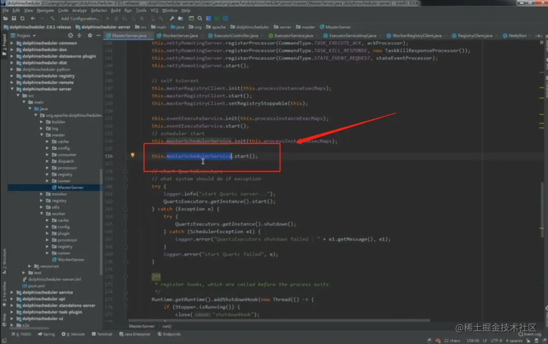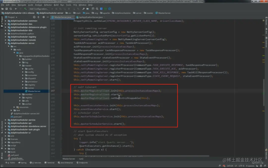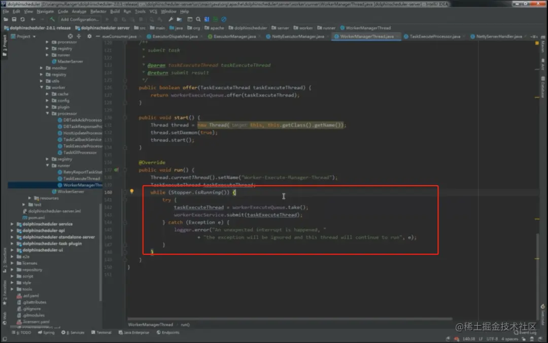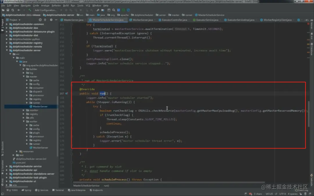 找到WorkServer.java中的main方法,进程代码也位于DolphinScheduler-Server模块下面