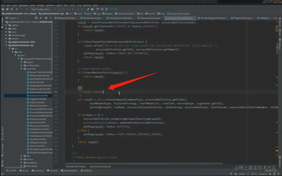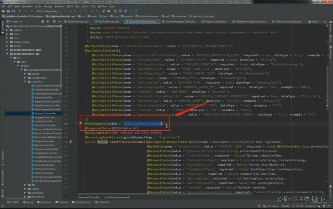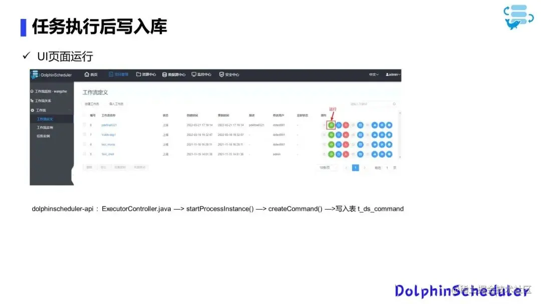 DolphinScheduler-api : ExecutorController.java → startProcessInstance() → createCommand() →写入表 t_ds_command