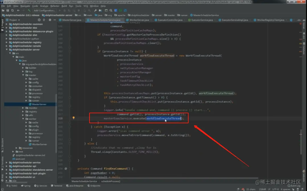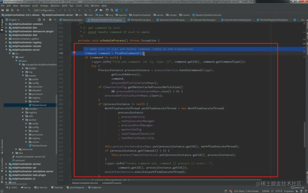 Dolphinscheduler-server: MasterSchedulerService.java → scheduleProcess() → findOneCommand() → 创建ProcessInstance