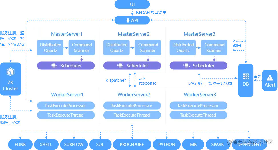 MasterServer主要负责 DAG 任务切分、任务提交监控,并同时监听其它MasterServer和WorkerServer的健康状态。