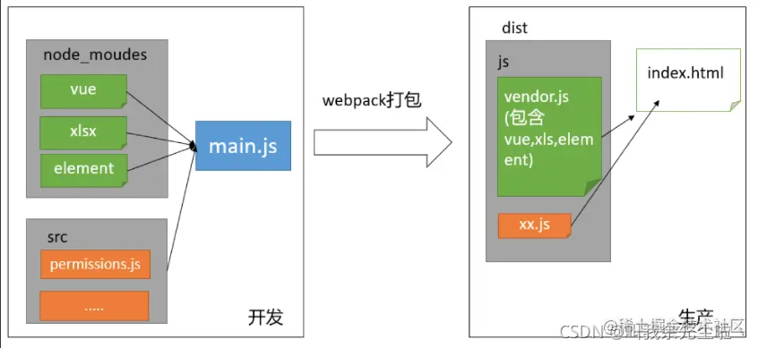 打包过程:从main.js开始出发,由webpack进行打包