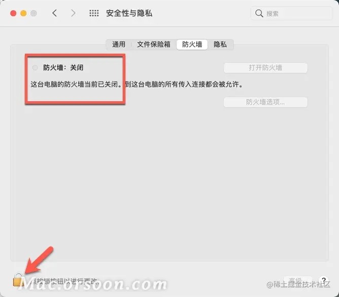 步骤3:查看防火墙的状态,如果是开启的状态,则先点击左下角锁状按钮,然后输入正确的密码后获得更改权限,之后在防火墙处点击关闭即可。