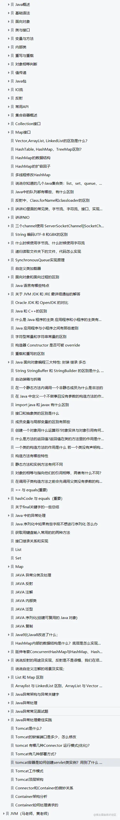从java基础语法、JVM、多线程到MySQL、spring、springboot、springcloud,再有dubbo、mybatis、redis、网络底层IO、Linux、MQ、zookeeper、netty、大数据、数据结构与算法、再到设计模式等等,可谓是非常之全!
