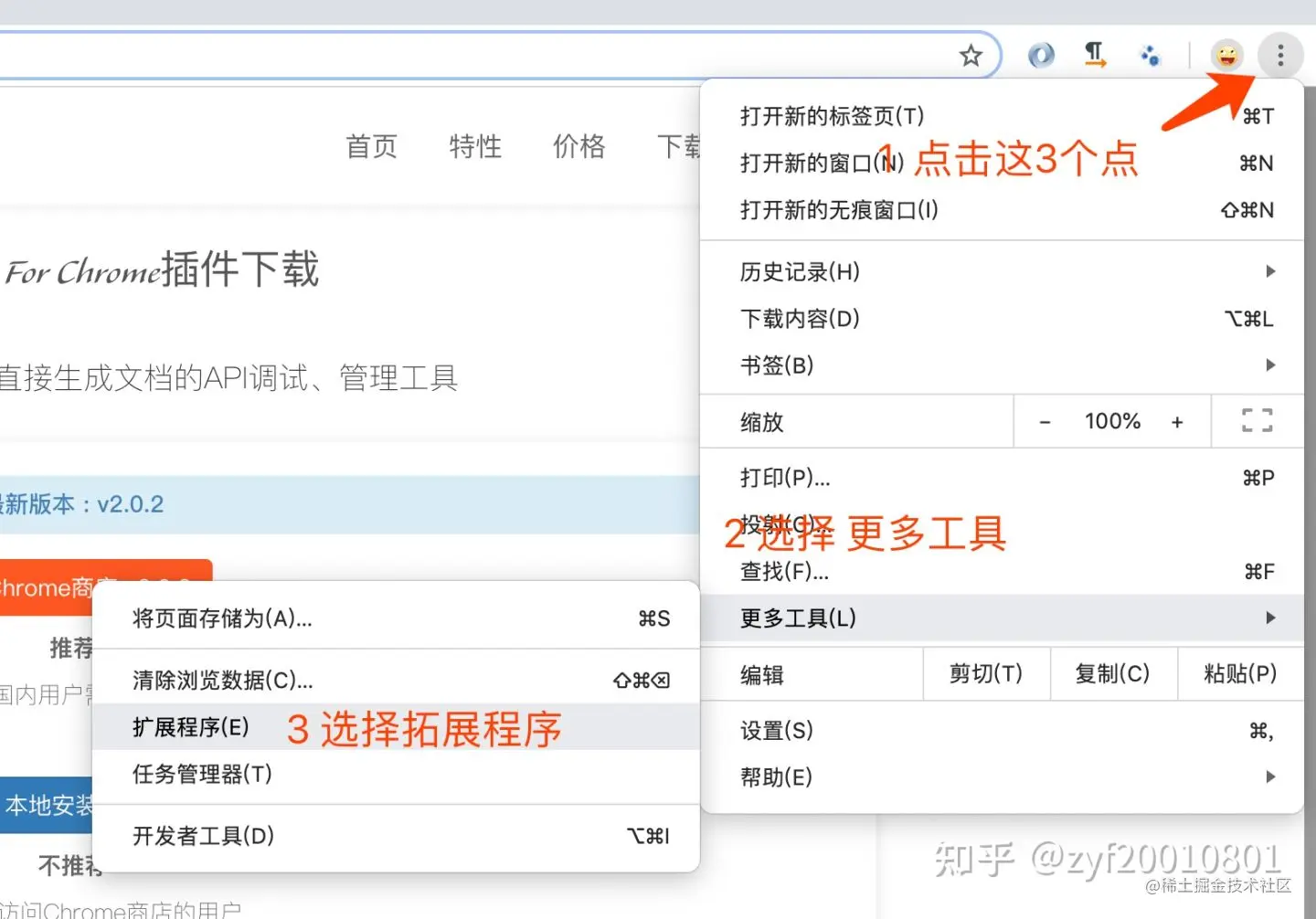 2、打开谷歌浏览器,点击右上角三个点-更多工具-拓展程序 进入拓展程序管理页码。如图