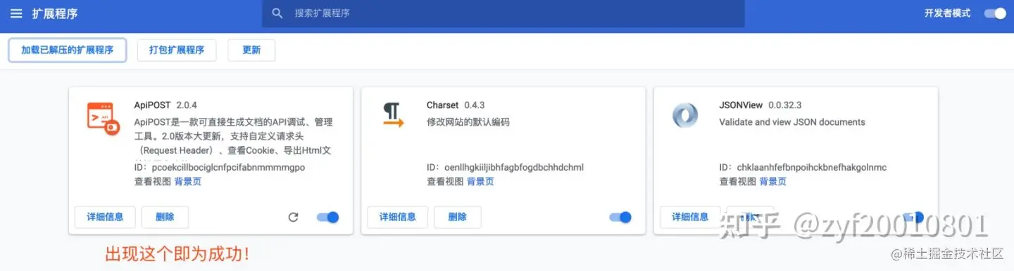 3、右上角打开开发者模式,然后点击 加载已解压的拓展程序,选择刚刚解压的apitpost拓展文件夹即可。如图
