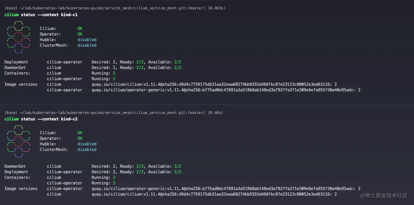 查看 c1 和 c2 集群的 Cluster Mesh 状态,当前两个集群都已经成功启用 Cluster Mesh,但是还未互相连接。