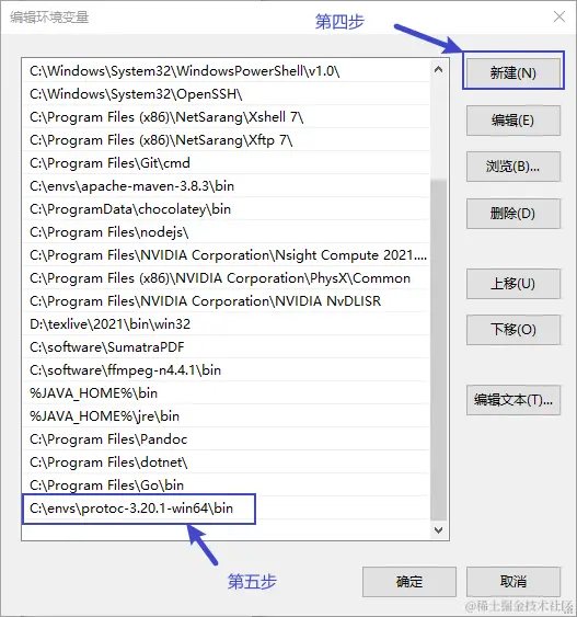 将解压后的文件夹中的bin目录加入系统环境变量中,如解压后bin路径为"C:\envs\protoc-3.20.1-win64\bin",则按下列步骤添加环境变量:
