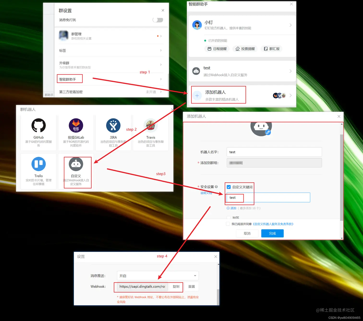 step3:给机器人命名,自定义关键字【这个必须要在发送消息里包含】,点击完成
