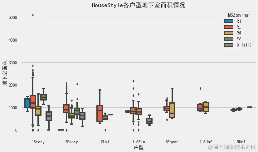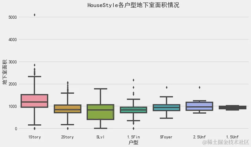 ax1.set_title('HouseStyle各户型地下室面积情况', fontsize=20)