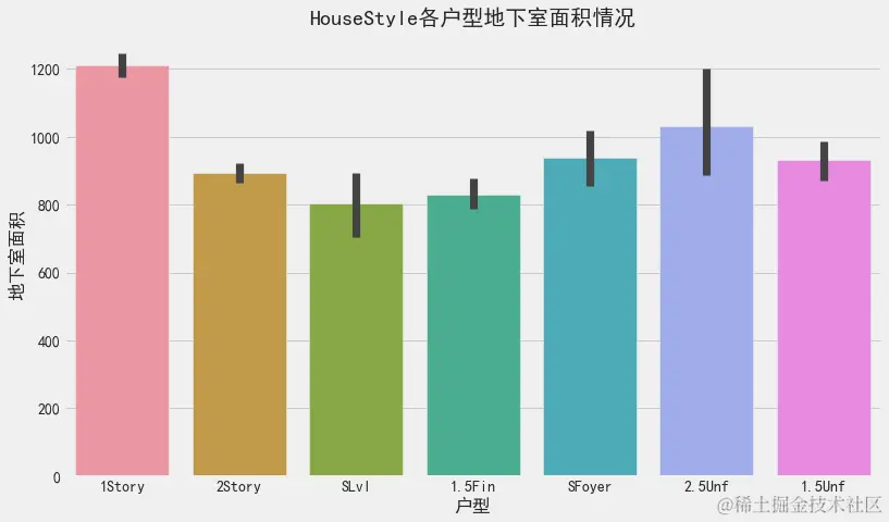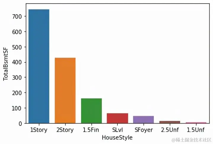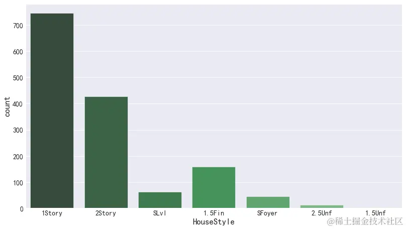 经过了数据处理,我们可以开始对数据进行分析了。举个例子,想要统计各种HouseStyle房子的数量,我们可以采用seaborn的barplot。(seaborn教程:seaborn.pydata.org/examples/in…)