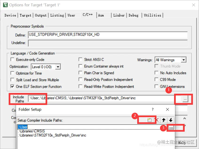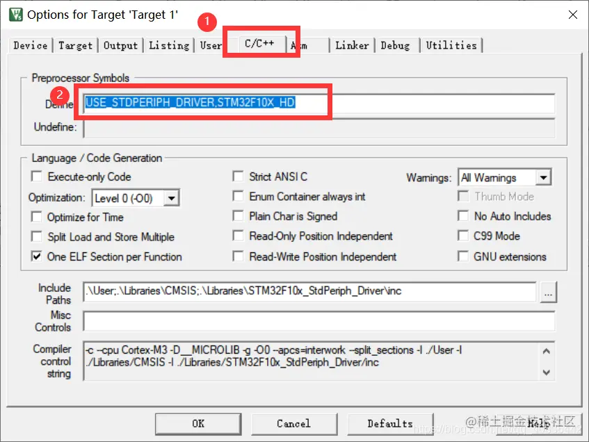 在C/C++界面需要添加宏定义USE_STDPERIPH_DRIVER,STM32F10X_HD,否则会出现报警,注意两个宏之间有一个逗号英文